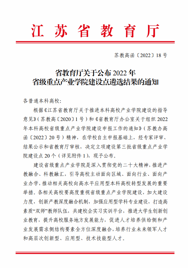 近日,江苏省教育厅下发了《省教育厅关于公布2022年省级重点产业学院建设点遴选结果的通知》(苏教高函〔2022〕18号),我校悦达新能源汽车学院获批省级立项。这是继我校新能源学院获得省级重点产业学院后,又一产业学院获此殊荣。