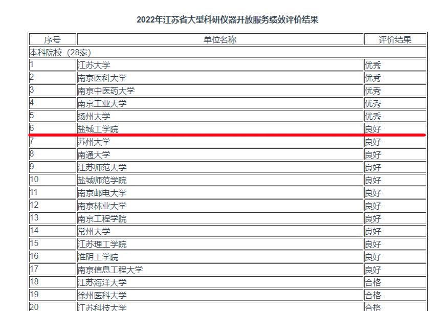 近日,江苏省科技厅联合省财政厅、省教育厅发布了2022年省属高校和科研院所等管理单位大型科研仪器开放服务绩效评价结果,我校荣获第六名,良好格次第一名。此项绩效评价工作已连续开展3年,我校在2020年、2021年的评价中分别荣获第七名、第六名,良好格次第三名、第一名,在同类院校中名列前茅。江苏省大型科研仪器开放服务绩效评价主要从资源整合能力、开放服务成效、运行管理水平及信用与安全等四个方面开展考核。