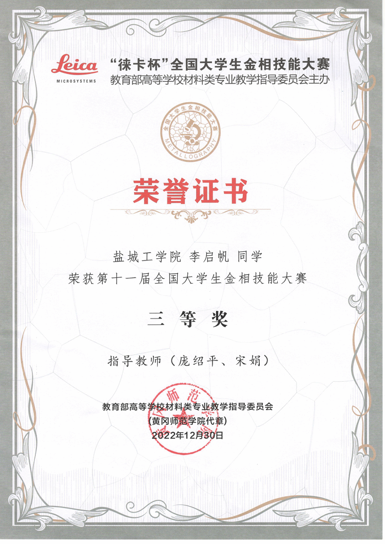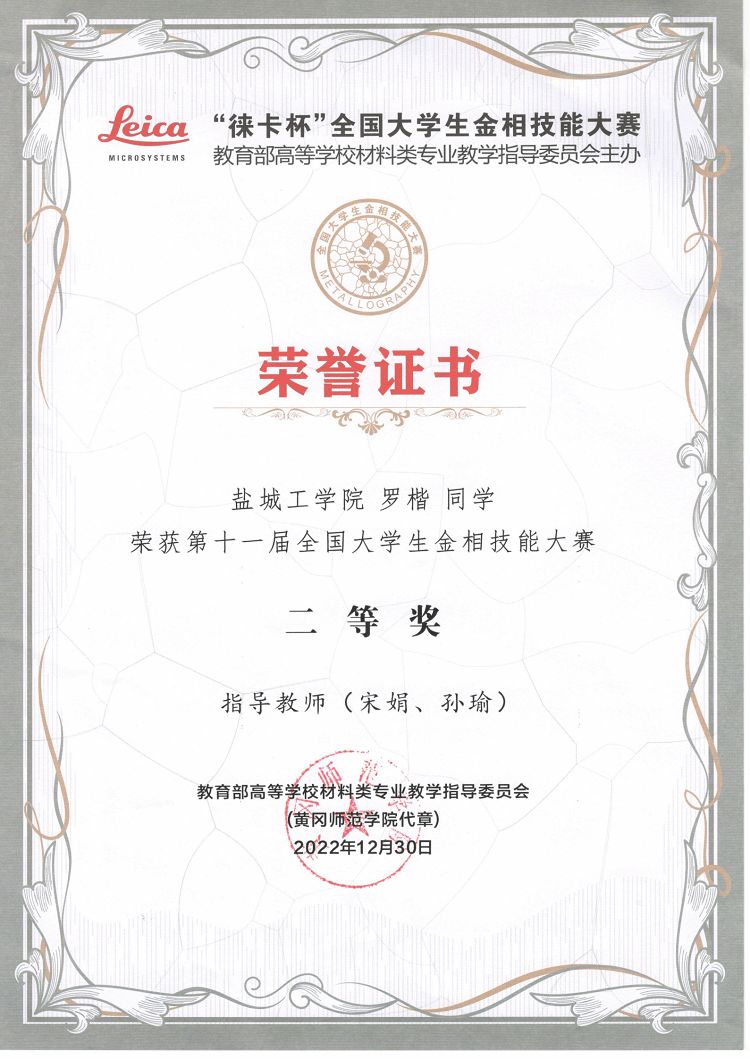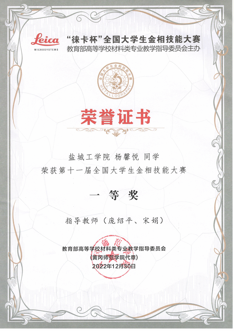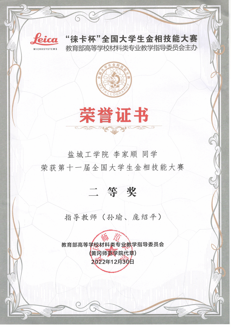 近日,第十一届全国大学生金相技能大赛结果公布,我校参赛队伍由材料学院孙瑜、庞绍平、宋娟三位老师指导,分别获得一等奖1项(学生:杨馨悦),二等奖2项(学生:李家顺、罗楷),三等奖1项(学生:李启帆)。至此,我校学生连续八年获得该赛事一等奖。