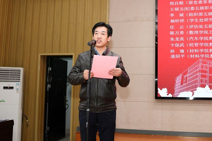 王资生宣读2022年度荣休教职工名单。工会主席谢毅敏、离退休工作处处长潘文东、材料学院党委书记唐浩对荣休教师送上感谢与祝福,衷心祝愿退休老师们保重身体、安享幸福,在新的人生旅程中收获更大的喜悦。