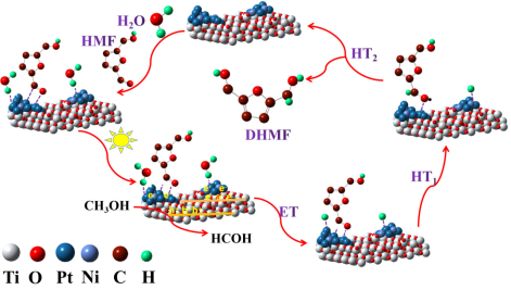 如何在常温常压条件下实现5-羟甲基糠醛(HMF)的高效转化是降低生产成本和提高生产效率的关键。以太阳能为驱动源的光催化反应可将HMF催化转化为2,5-二羟基甲基呋喃(DHMF)。该技术只需HMF和H2O的参与且无需额外的能源输入,是一种绿色环保的合成方法。本文从HMF还原反应特点入手,设计合成了双金属PtNi修饰的TiO2光催化剂(PtNi/TiO2)。在常温常压下,PtNi/TiO2表现出优异的选择性HMF氢化的催化活性,其HMF的转化效率和产物DHMF的选择性分别达到100%和99.7%。优异的催化性能得益于PtNi合金和TiO2之间的电子耦合以及PtNi-TiO2间界面结构的导向性衍变。结构的衍变不仅有效地促进了光生电荷的分离和迁移迁移而且有利于HMF在PtNi表面以η2-(C,O)构型吸附,促进了HMF分子中醛基(C=O)基团的快速选择性活化和CHO⋅反应中间体的生成,进而显著提升了HMF的转化效率和还原产物的选择性。HMF选择性氢化对化工行业的发展有重要意义,本项工作对架构高效稳定的光催化HMF氢化材料具有一定的借鉴意义。
