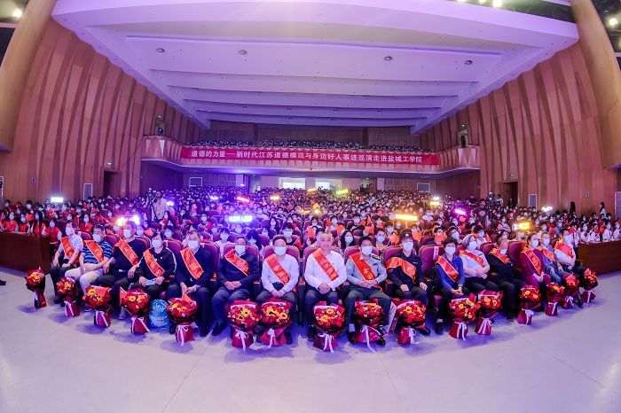 5月17日下午,由江苏省委宣传部、江苏省文明办、江苏省教育厅主办的“道德的力量”——新时代江苏道德模范与身边好人事迹巡演活动在我校希望大道校区行政楼报告厅成功举办。全国道德模范、中国好人、江苏省道德模范、江苏好人、盐城市道德模范、盐城好人和我校“感动盐工”人物代表出席活动。省委宣传部道德建设指导处四级调研员齐梓辰,盐城市委宣传部副部长、市文明办主任赵国峰,我校党委副书记、校长邵荣,党委副书记薛浩,党委常委、副校长王资生,副校长、盐城市政协副主席丁成,党委常委、纪委书记、省监委派驻盐城工学院监察专员陈伟,党委常委、组织部部长邢晓平,党委常委、宣传部部长奚新国,省委宣传部道德建设指导处主任科员陈飞宇,市文明办副主任夏斌、道德建设指导处副处长张扬,我校党务部门负责人、部分二级党组织负责人、马院教师、辅导员代表等观看演出。