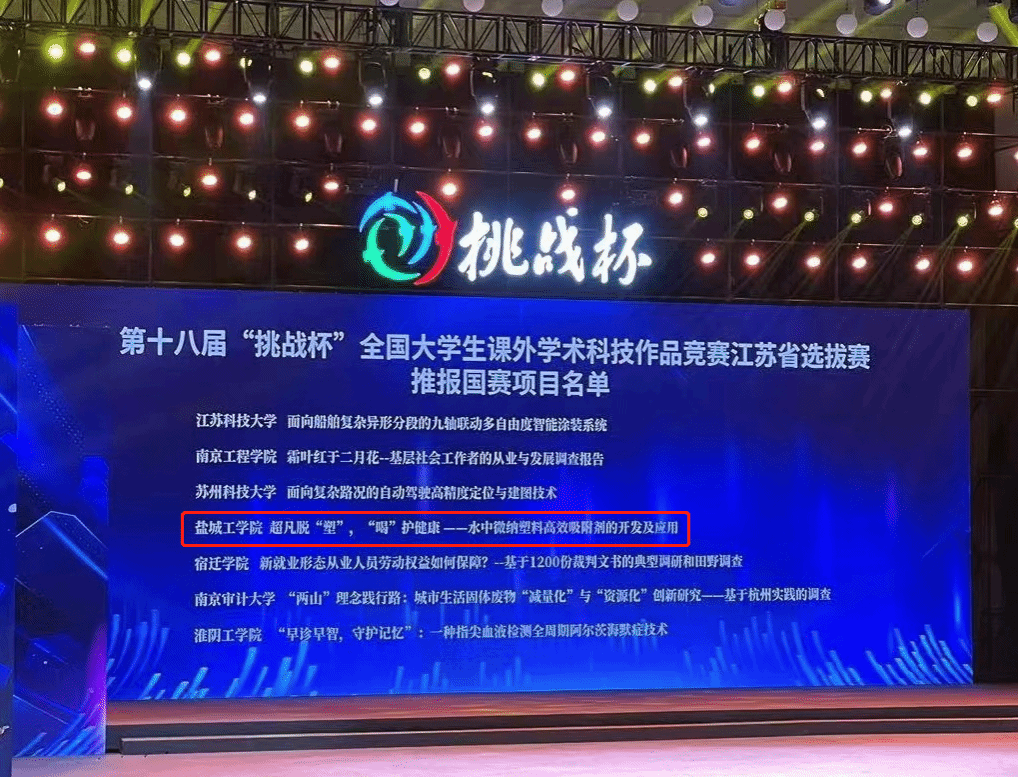 5月26日至28日,第十八届“挑战杯”全国大学生课外学术科技作品竞赛江苏省选拔赛决赛在常州大学举行。经过现场答辩激烈角逐,我校作品《超凡脱“塑”,“喝”护健康——水中微纳塑料高效吸附剂的开发及应用》荣获主体赛一等奖,并成功入围江苏省推报国赛项目名单。《触“钼”兴“碳”,“蒸蒸”日上——基于二硫化钼碳复合气凝胶的太阳能海水淡化系统研究》《冰箱电子鼻,“嗅”色可餐——李斯特菌气敏传感快速检测仪》2项作品荣获黑科技专项赛“恒星级”作品。