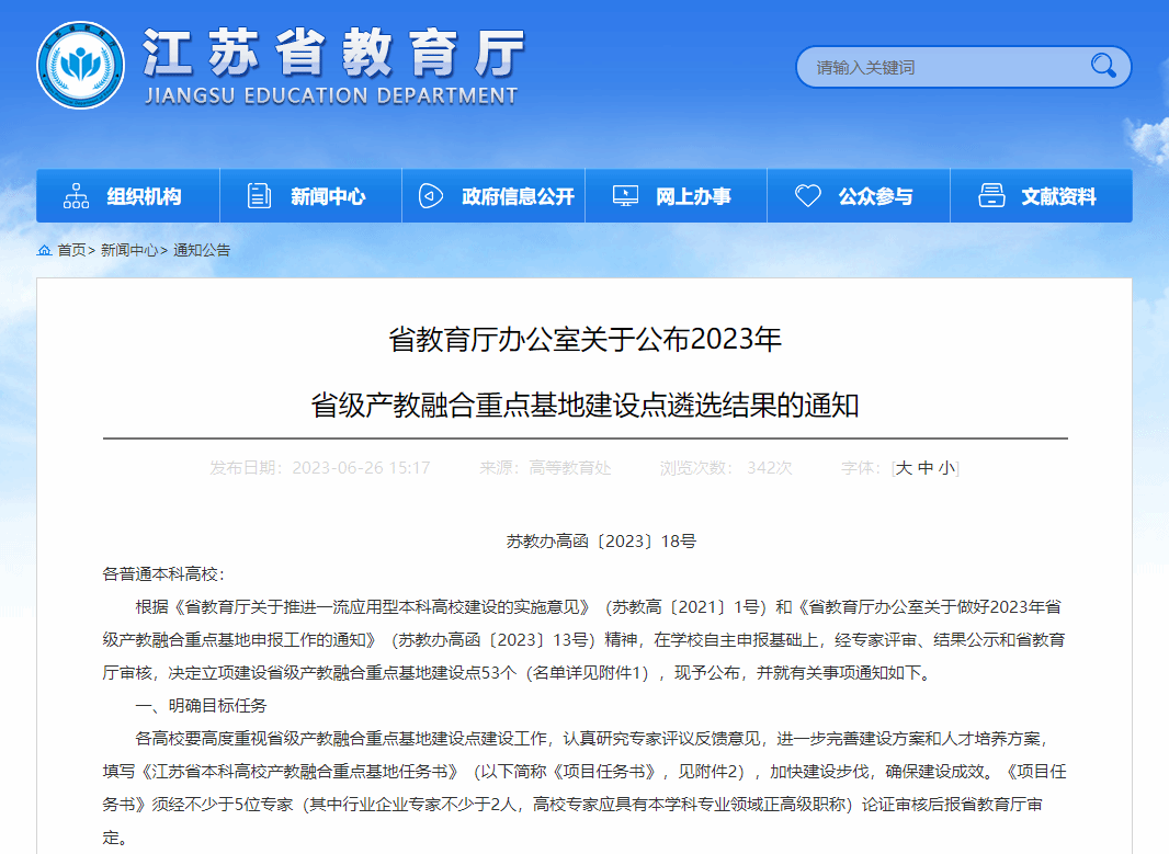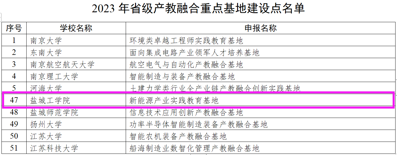 近日,江苏省教育厅下发《关于公布2023年省级产教融合重点基地建设点遴选结果的通知》(苏教办高函〔2023〕18号),我校新能源产业实践教学基地获批立项,成为首批立项建设的53个省级产教融合重点基地建设点之一。这是我校继获批7个省级产教融合型品牌专业建设点,6门省级产教融合型一流课程后,在产教融合方面取得的又一重要成果。此次基地获批将对我校深化产教融合、科教融汇,推进创新链、产业链、人才链、教育链有机融合发挥巨大推动作用。