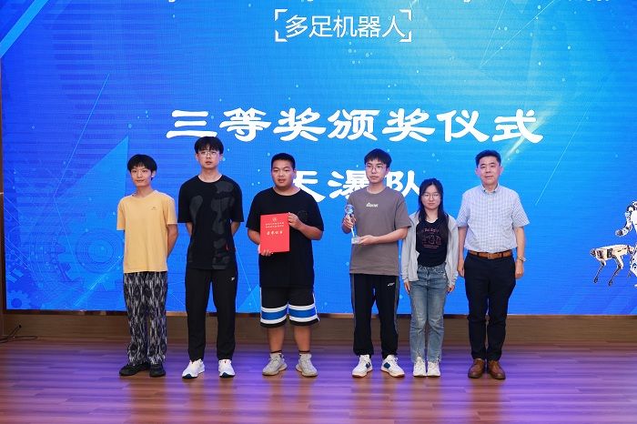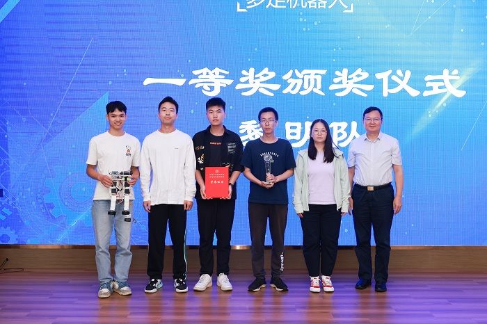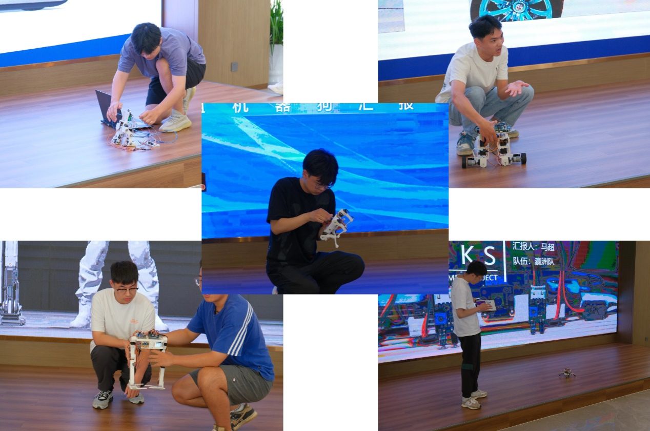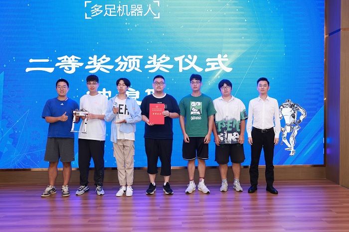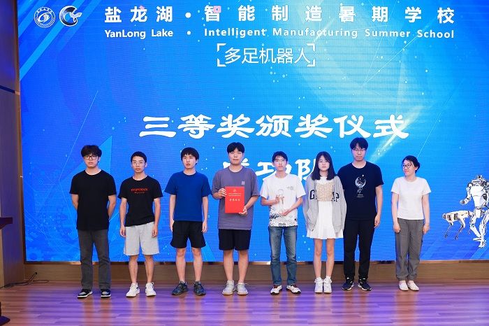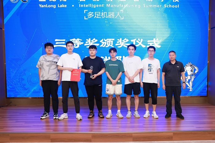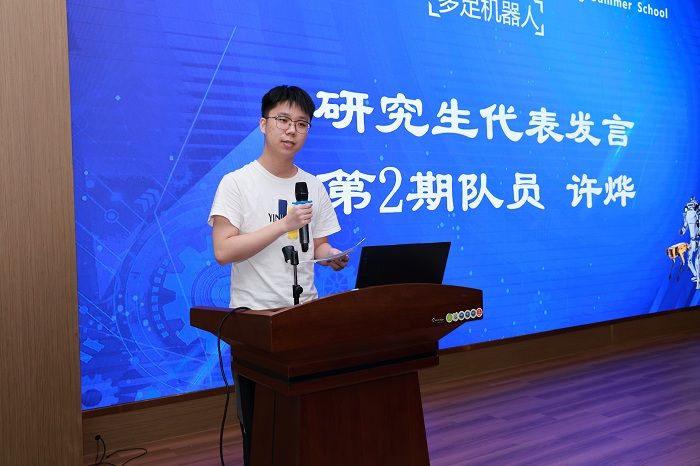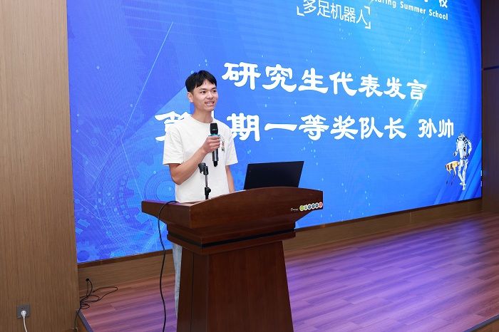 暑期学校第一期32名学员分5支队伍,分别完成了多足机器人的实物样机开发与制作,并在活动现场进行了项目路演与汇报答辩,由12位专家评委现场打分并决出一二三等奖。崔刚为一等奖代表队颁奖,沈振兴为二等奖代表队颁奖,企业专家为三等奖代表队颁奖。许伟宣读表彰决定。一等奖代表队孙帅同学及第二期学员代表许烨同学分别发言。暑期学校活动指导老师卢倩博士对各队伍的方案进行了点评,对第二期35名学员即将开始45天“人形机器人”的学习培训提出具体要求。