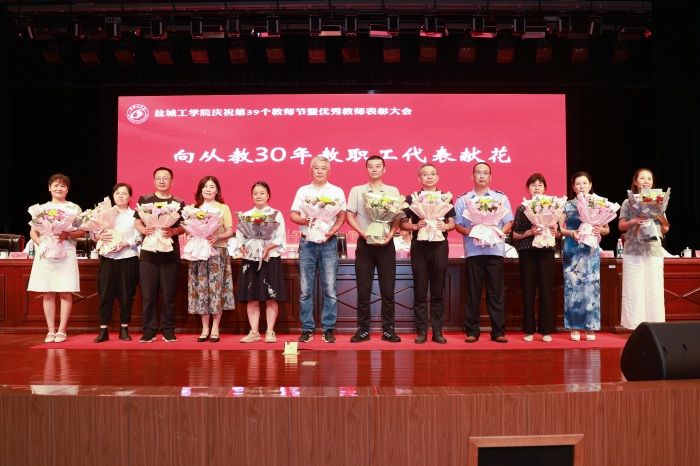 会上,学生向2023年从教30年教职工代表献花。学生代表、江苏省优秀学生干部、土木工程学院B给排水201班班长葛爱军同学致谢。优秀教师代表、海洋与生物工程学院聂庆,先进集体代表、环境科学与工程学院副院长陈天明(主持工作)分享自己的教育教学经验和感悟。