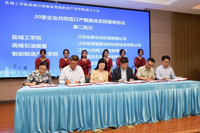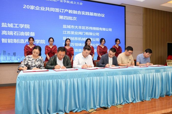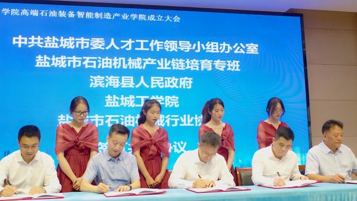 会上,中共盐城市委人才工作领导小组办公室、盐城市石油机械产业链培育专班,滨海县人民政府、盐城工学院、盐城市石油机械行业协会签订共建协议。盐城市教育局副局长徐卫东,盐城市石油机械行业协会会长韩正海,实践基地企业代表、圣泰阀门董事长严涛,盐城工学院高端石油装备智能制造产业学院院长陈青作了发言。