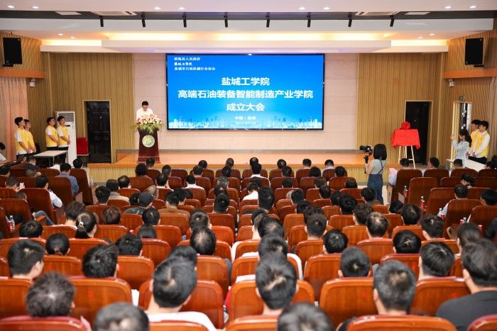 校长、党委副书记邵荣,中国阀门协会会长吴建新,盐城市人民政府副秘书长顾亚军,滨海县委书记、县长吴启标分别致辞。邵荣、吴建新共同为高端石油装备智能制造产业学院揭牌。校党委常委、副校长王伟主持成立大会。市委组织部、人才办、市商务局、科技局、教育局、民政局、滨海县人民政府、滨海县经济开发区、江苏沿海人才市场等部门负责同志,行业专家、新闻媒体、石油机械行业协会暨共建企业领导和代表,学校相关部门、二级学院主要负责同志,高端石油装备智能制造产业学院全体师生等350余人参加。