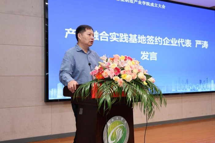 实践基地企业代表、圣泰阀门董事长严涛发言 盐城工学院高端石油装备智能制造产业学院院长陈青发言