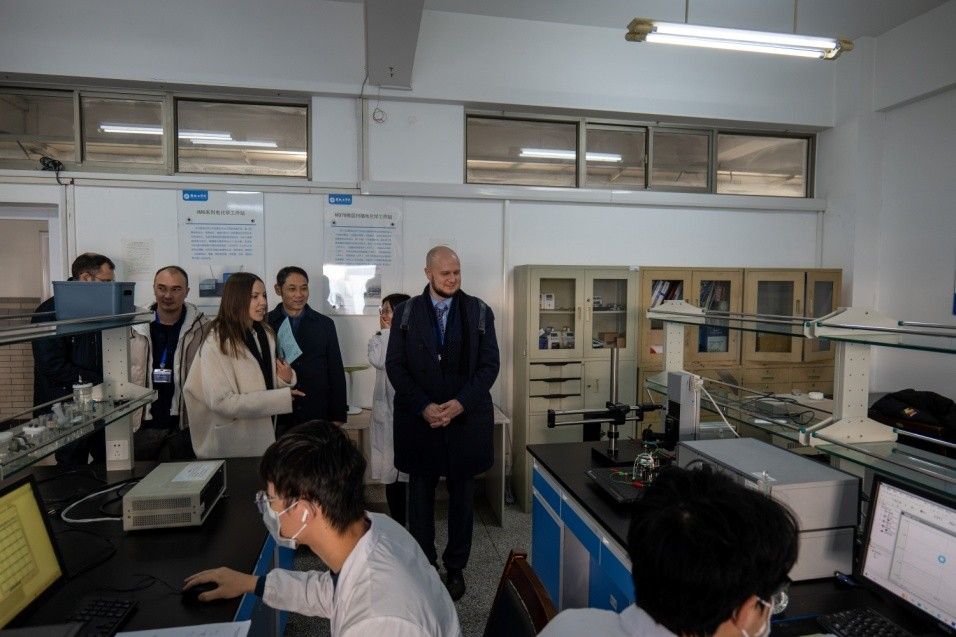 考察团一行参观了学校分析检测中心、图书馆等场所,惊叹于我校良好的办学条件。重点考察了新能源与环境电化学研究院,参观了电化学相关所有实验室,对我校在电化学工程技术方面完备的研究条件及为企业服务的研究宗旨表示赞赏。与研究院相关老师及安凯特相关人员就电化学技术装备在该公司的应用细节进行了深入地讨论,对研究院在两个企业项目合作中发挥的积极作用表示肯定和谢意。考察团一行还兴致勃勃地在学生食堂就餐,体验学生生活。