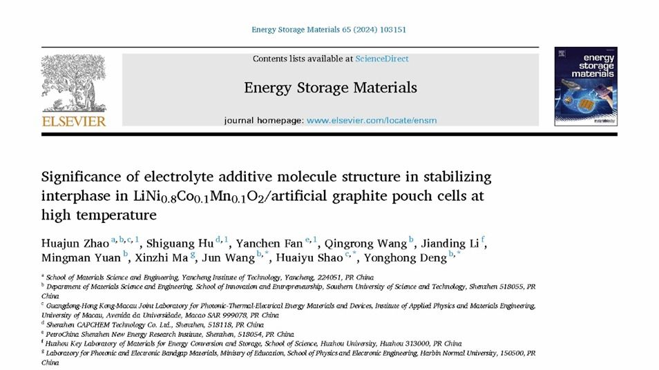 近日,我校材料学院赵华军博士在国际材料学科顶级期刊《Energy Storage Materials》上发表题为《Significance of Electrolyte Additive Molecule Structure in Stabilizing Interphase in LiNi0.8Co0.1Mn0.1O2/Artificial Graphite Pouch Cells at High Temperature》的研究成果,论文链接https://doi.org/10.1016/j.ensm.2023.103151。《Energy Storage Materials》主要发表储能材料等领域的重大新发现,涉及材料的合成、制备、结构、性能和技术应用,以及它们在电化学、化学、电学、热学、磁性和机械能存储装置中的应用,是国际公认的材料领域顶级专业期刊,在业界享有极高的声誉,最新影响因子为20.4。