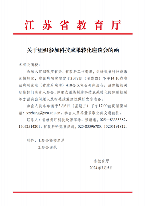 3月7日,我校作为全省的10个代表高校之一,受邀参加省政府政策研究室组织的全省科技成果转化座谈会。会上,我校产业技术研究院和科学技术处介绍了我校技术转化工作经验,并围绕制约全省科技成果转化的体制机制等方面突出问题以及相关政策建言献策。
