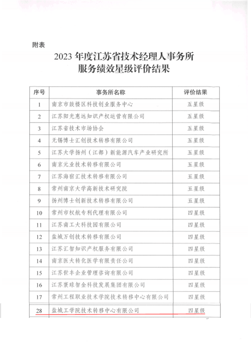 近日,江苏省资源统筹服务中心、江苏省技术产权交易市场联合发文,对全省95家省级技术经理人事务所2023年服务绩效进行评价。省技术产权交易市场共受理82家事务所绩效评价材料,经形式审查、专家评价等程序,公布2023年度绩效评价星级榜单。全省共有42家事务所进入星级榜单。我校技术转移中心有限公司与东南大学、南京农大等8家省内高校技术经理人事务所,同列4星级榜单。