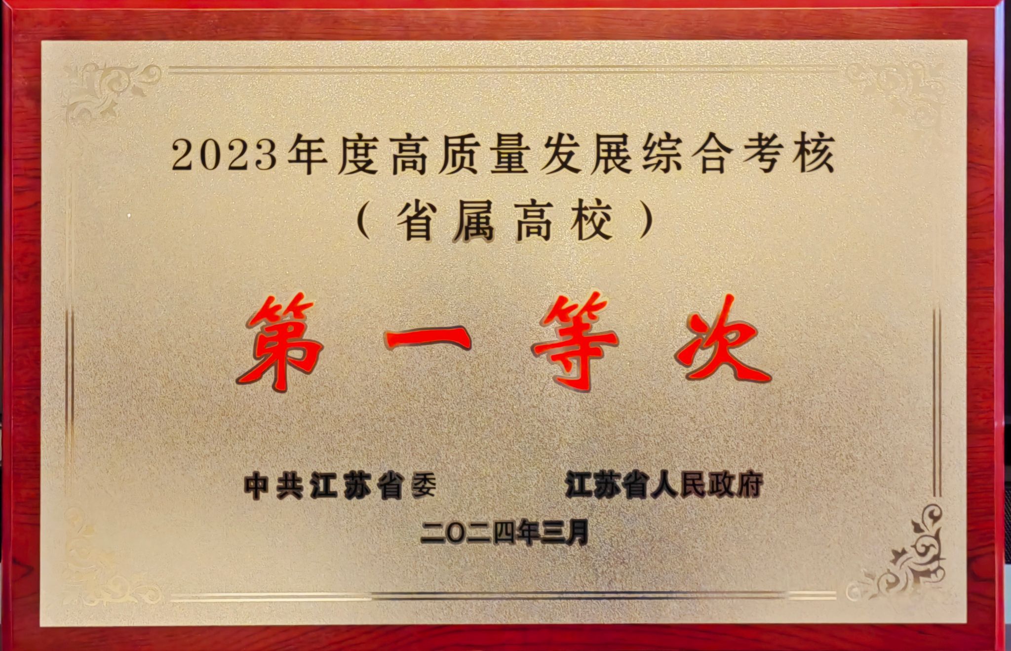 3月25日下午,江苏省委、省政府在南京召开全省2023年度高质量发展总结暨2024年工作推进会议,通报省2023年度综合考核结果,表彰了考核优秀的单位、地区和高校。我校位列2023年度省属高校高质量发展综合考核第一等次,连续四年荣获第一等次表彰。校党委书记方海林在南京主会场参加会议,并作为高校代表登台领奖。