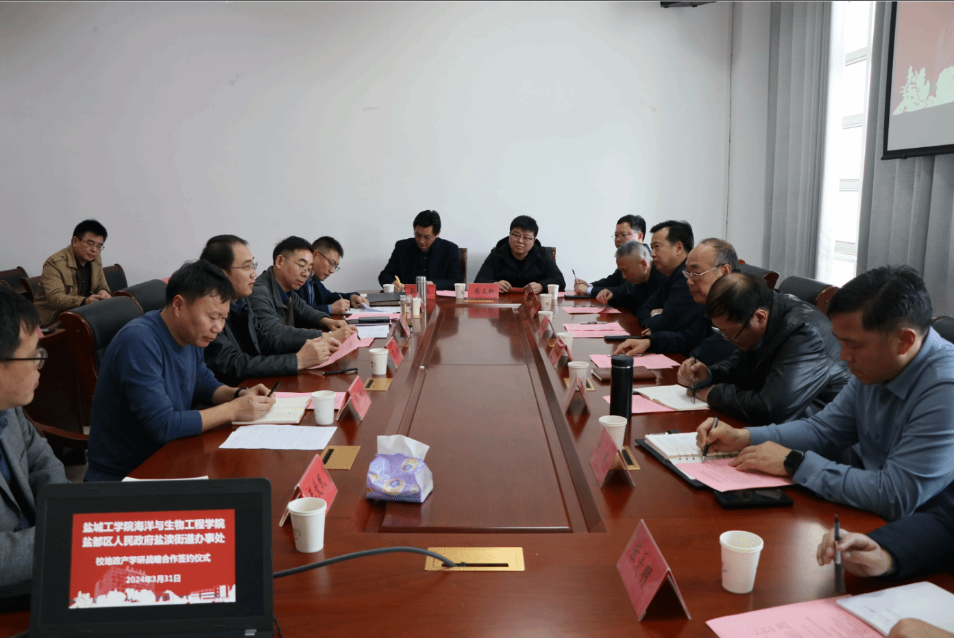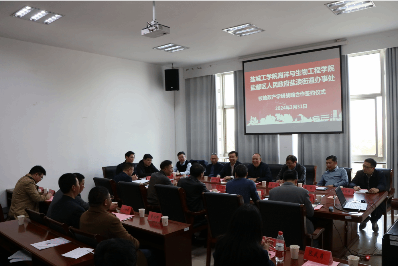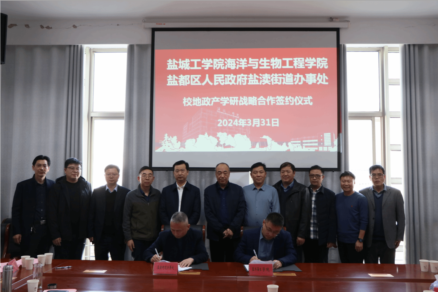 3月31日下午,我校与盐都区盐渎街道办事处在建军东路校区海洋与生物工程学院会议室签订战略合作协议。双方致力在促进产学研深度融合、加快盐城特色渔业创新发展,助力乡村振兴、科技兴农,助推经济社会高质量发展等方面开展深入合作。我校副校长、市政协副主席丁成,盐城市农业农村局渔业处处长陶其军、水产站站长李平、水产站书记张爱民,盐都区农业农村副局长陈明、水产站站长陈正轩,盐渎街道办事处主任任浩、副主任徐光明,盐城市上水环境生物公司董事长邵鹏,我校海生学院院长彭斌、副院长齐志涛等出席。学院党总支书记高留才主持签约仪式。