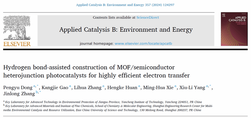 近日,我校产业技术研究院董鹏玉教授为第一作者、以盐城工学院为第一单位的研究论文“Hydrogen bond-assisted construction of MOF/semiconductor heterojunction photocatalysts for highly efficient electron transfer”在化学类顶级期刊《Applied Catalysis B: Environment and Energy》 (357 (2024) 124297) 上发表。《Applied Catalysis B: Environment and Energy》是Elsevier旗下重要期刊,该期刊2023年影响因子为22.1,主要刊登催化化学领域高水平的研究成果,属于化学类Top期刊与中科院1区期刊。