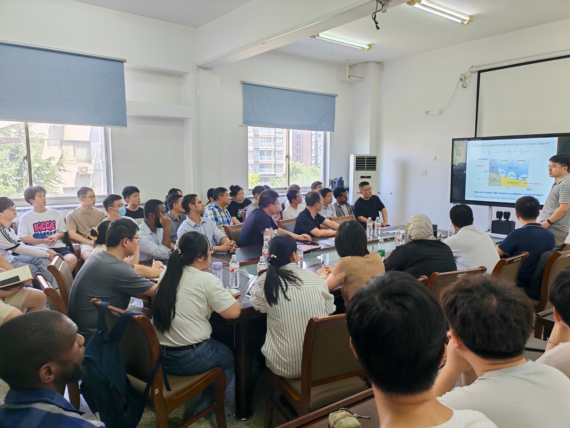 陈钢教授以《Spin-orbit Coupling of the t2g Orbitals in Quantum Materials》为题,介绍了强弱关联物理的研究内容及应用,展示了由电子关联和自旋轨道耦合(SOC)共同作用引发的现象,以及4d和5d元素在重过渡金属化合物中的出射量子相和跃迁等研究成果。他认为,这是一个年轻、活跃、快速发展的领域,自旋-轨道耦合莫特绝缘体可能为实现各种新奇的量子相提供一个舞台。在交流环节中,陈钢教授与参会师生针对元素掺杂对结构、性能的影响及机理等问题展开了深入的交流和讨论。