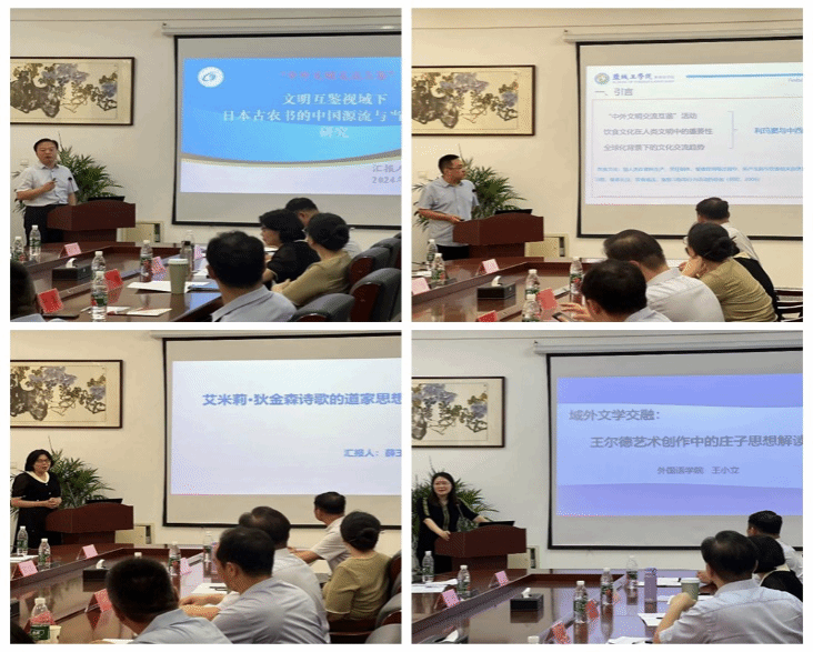 校内教师学术交流环节,外国语学院院长叶磊、副院长周学恒、校狄金森研究所所长薛玉秀、校外国文学研究中心主任王小立,聚焦“中外文明交流互鉴”主题,立足各自主持承担的科研基金项目,分别作题为“文明互鉴视域下日本古农书的中国源流与当代价值研究”“《利玛窦中国札记》与中西饮食文化交流”“艾米莉·狄金森诗歌的道家思想解读”“王尔德艺术创作中的庄子思想解读”的学术交流分享。南京农业大学王银泉教授、外国语学院王奇教授对分享内容进行了逐一点评,并给予了针对性和建设性的指导建议。