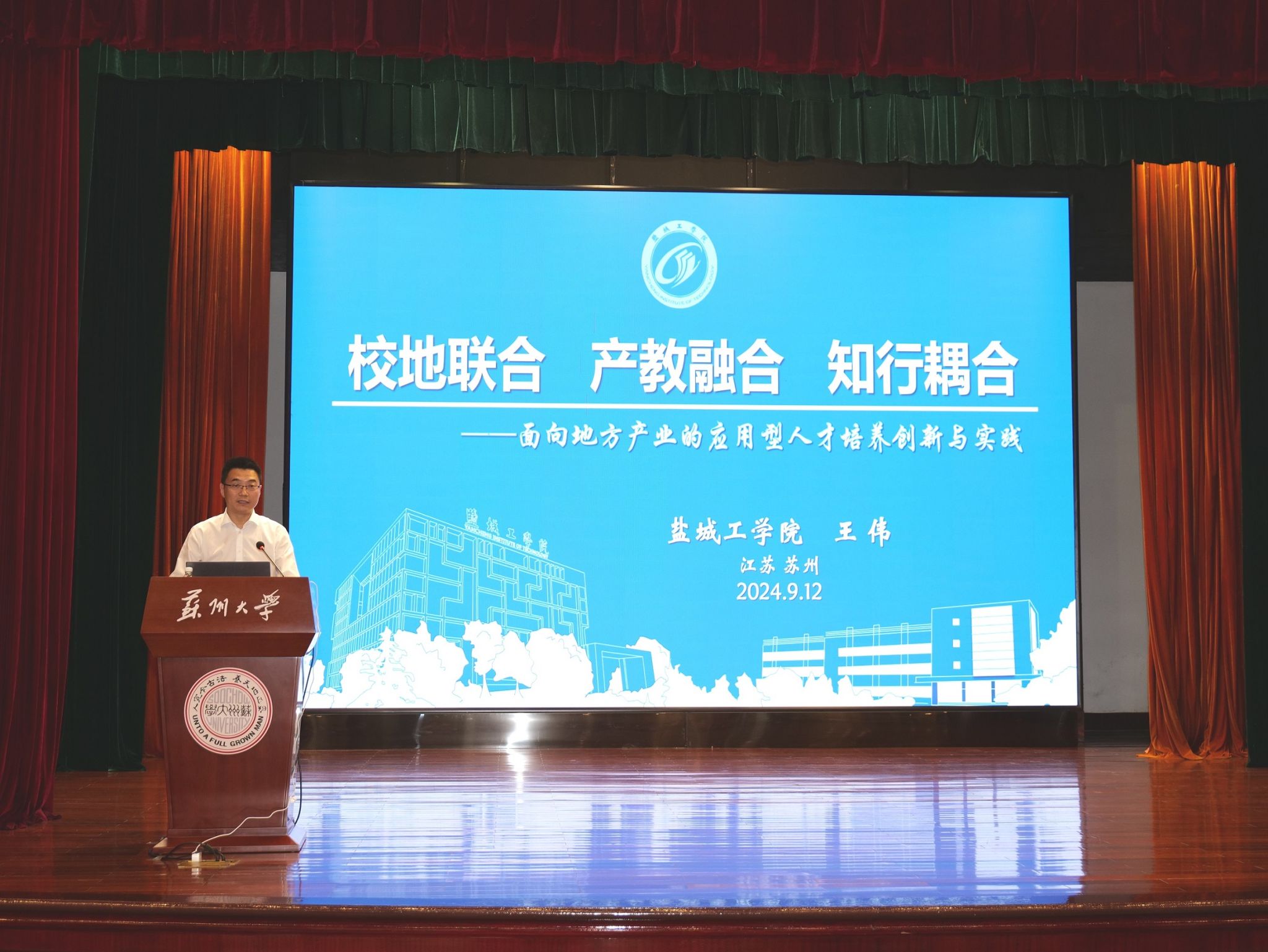 9月12日,由江苏省高等学校教学管理研究会组织、江苏省教育厅指导、苏州大学承办的2022年高等教育(本科)国家级教学成果推广培育会议在苏州举行。我校党委常委、副校长王伟应邀作题为《校地联合 产教融合 知行耦合:面向地方产业的应用型人才培养创新与实践》的报告,针对我校2022年获得国家级教学成果二等奖进行了经验分享。