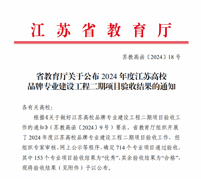近日,江苏省发布《省教育厅关于公布2024年度江苏高校品牌专业建设工程二期项目验收结果的通知》(苏教高函〔2024〕18 号),我校环境设计、海洋技术、计算机科学与技术、财务管理等4个专业全部通过验收。