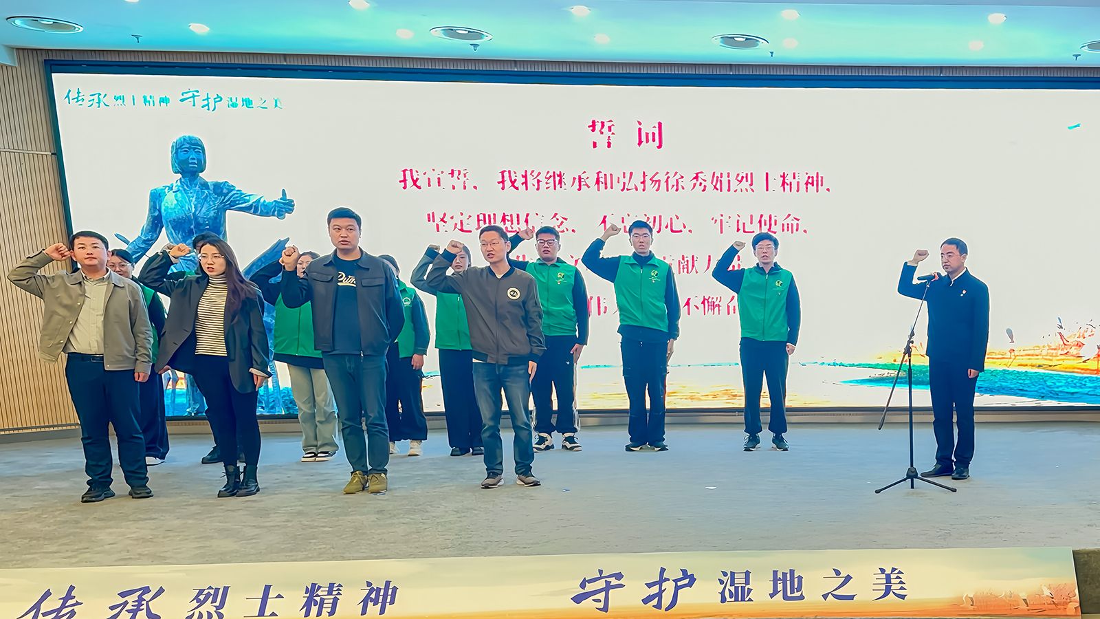 团日共建活动现场,邢晓平为盐城工学院徐秀娟黄海湿地保护志愿者协会志愿者代表授“新时代徐秀娟式志愿者团队”旗;胥爱国与相关单位代表共同发布“一个真实的故事”红色主题自然教育活动;我校徐秀娟黄海湿地保护志愿者协会志愿者代表们集体宣誓,用铮铮誓言表达传承和弘扬徐秀娟烈士精神的坚强决心。