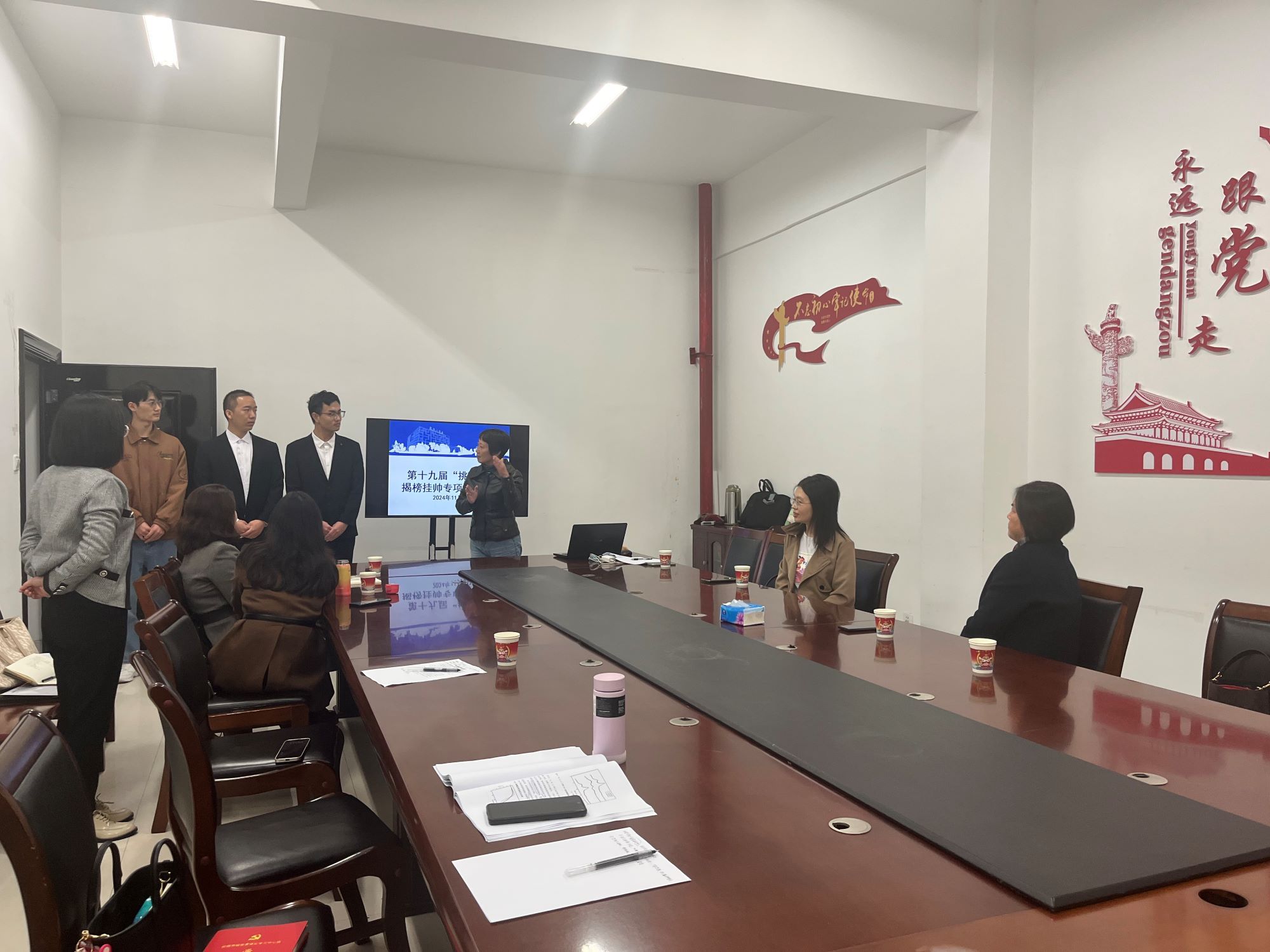 为更好地推动第十九届“挑战杯”揭榜挂帅专项赛备赛工作,11月8日下午,学校在希望大道校区团委会议室召开第十九届“挑战杯”揭榜挂帅专项赛决赛项目专家指导会,项目成员进行了项目展示,汇报了作品近期改进情况。校党委常委、副校长、组织部部长邢晓平,原工会主席孙琴,纺织服装学院院长王春霞现场指导,会议由校团委书记杨秀丽主持。校团委相关人员、项目指导教师等参加。