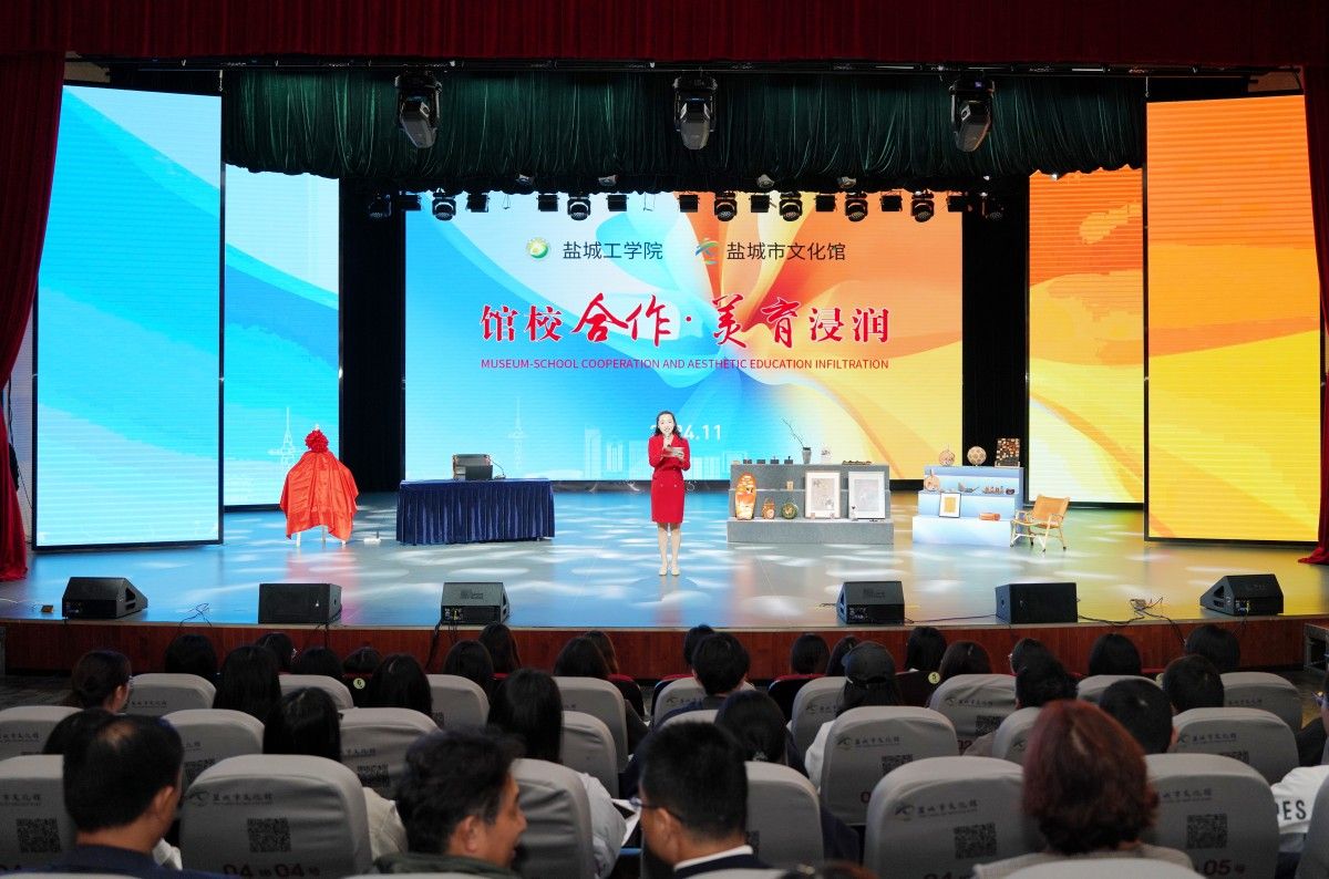 在盐城市文化馆群星剧场,我校党委常委、副校长王伟,盐城市文化馆党支部书记、馆长、盐城市非遗保护中心主任杨莺出席活动并为“盐城工学院美育实践基地”揭牌。我校教务处处长余晓红,设计艺术学院院长张军、党总支书记刘荣及师生代表,人文社会科学学院师生代表等50余人参加揭牌仪式。