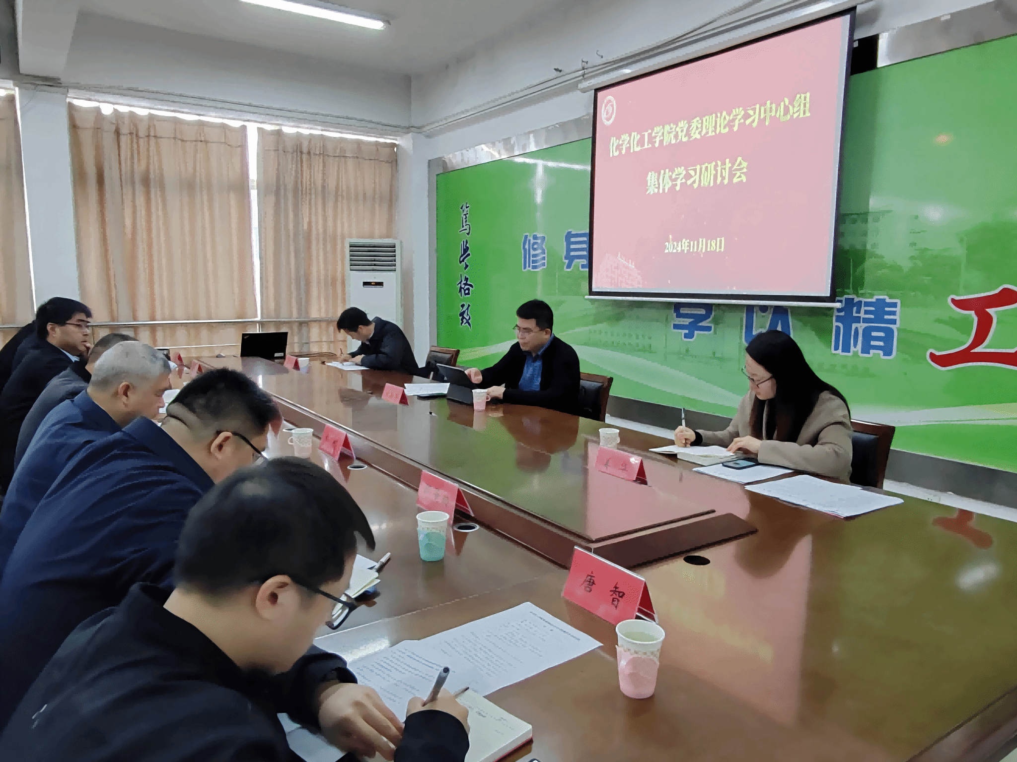 11月18日上午,化学化工学院党委理论学习中心组在北校区学院会议室召开集体学习研讨会。校党委第七巡学旁听组组长、党委常委、副校长张勤芳,校党委第七巡学旁听组成员、党委研究生工作部副部长姜华,校党委第七巡学旁听组秘书李科旁听指导。化学化工学院党委书记庞辉主持,学院党委理论学习中心组全体成员参加。