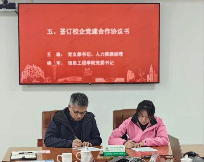 杨军代表学院教工一支部与江苏博敏电子有限公司党支部书记王瑜签订党建共建合作协议书。双方表示将以党建引领业务发展为核心,不断加强交流与合作,共同开创党建工作的新局面,在人才培养、科学研究、社会服务、实践育人等方面实现更深层次的合作。通过本次党建共建活动,校企双方党总支实现了加强交流、协作互通,推动了教育、人才、创新、产业各方面的有效融合,形成了人才培育及企业发展互促互进的共赢格局。下一阶段,信息工程学院将以党支部联建共建为载体,不断提高党建工作水平,持续深化产教融合,进一步提升人才培养质量,实现以党建引领学院事业高质量发展,为中国式现代化做出更大贡献。