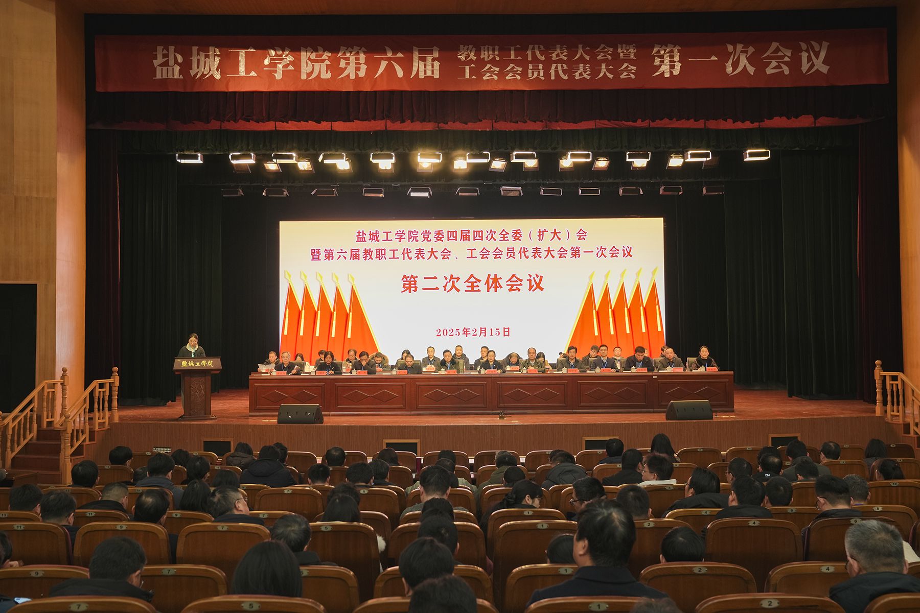2月15日,学校在希望大道校区行政楼报告厅召开党委四届四次全委(扩大)会暨第六届教职工代表大会、工会会员代表大会第一次会议。校党委书记方海林,党委副书记、校长邵荣,盐城市总工会副主席周小进,盐城市教育局四级调研员、教育工会常务主任吴恒广,校党委副书记薛浩,党委常委、副校长王资生,副校长、盐城市政协副主席丁成,党委常委、副校长王伟,党委常委、纪委书记、省监委派驻盐城工学院监察专员陈伟,党委常委、副校长张勤芳,党委常委、副校长、组织部部长邢晓平和驻盐兄弟高校工会主席出席会议。薛浩主持会议。我校党委常委,党委委员、纪委委员,第六届教代会暨工代会代表、列席人员,其他科级以上干部、专业系主任、课程组主任、实验中心主任及科研业务机构内设单位主任以及离退休人员代表等400余人参加会议。