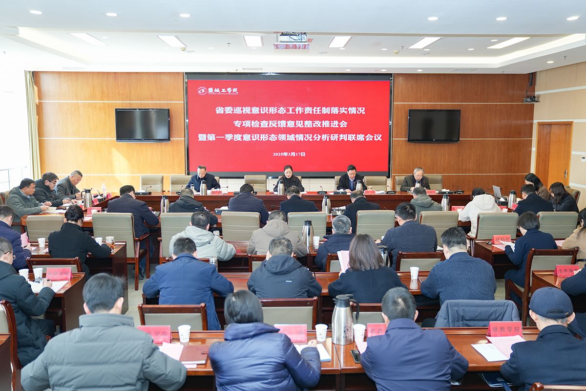奚新国汇报《盐城工学院党委关于省委巡视落实意识形态工作责任制情况专项检查报告的整改工作方案》,并部署集中整改阶段相关工作。党委学生工作部部长杨汉华、党委研究生工作部部长许伟、化学化工学院党委书记庞辉、设计艺术学院党总支书记刘荣、党委宣传部副部长赵迎华作第一季度意识形态领域情况分析研判发言。