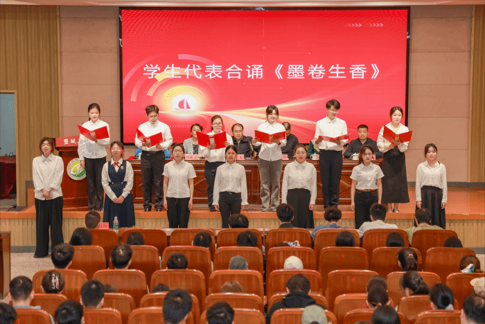 启动仪式上,丁成等为2024年度阅读之星代表、读者协会优秀会员及优秀部门代表颁发荣誉证书。学生处处长杨汉华号召师生读者养成“爱读书、读好书、善读书”的良好习惯。图书馆馆长李明宣读盐城工学院2025年度校园阅读推广系列活动通知,就活动安排主题、活动形式、品牌特色等进行了介绍。学生代表分角色合诵《墨卷生香》,通过《诗经》《楚辞》《理想国》等中西经典文本的声韵交织,以墨香为舟、文字为桨,演绎千年文明的精神图谱。