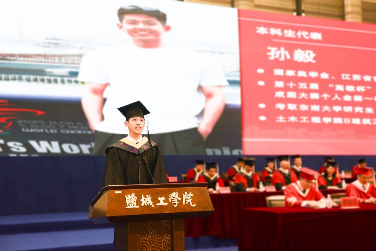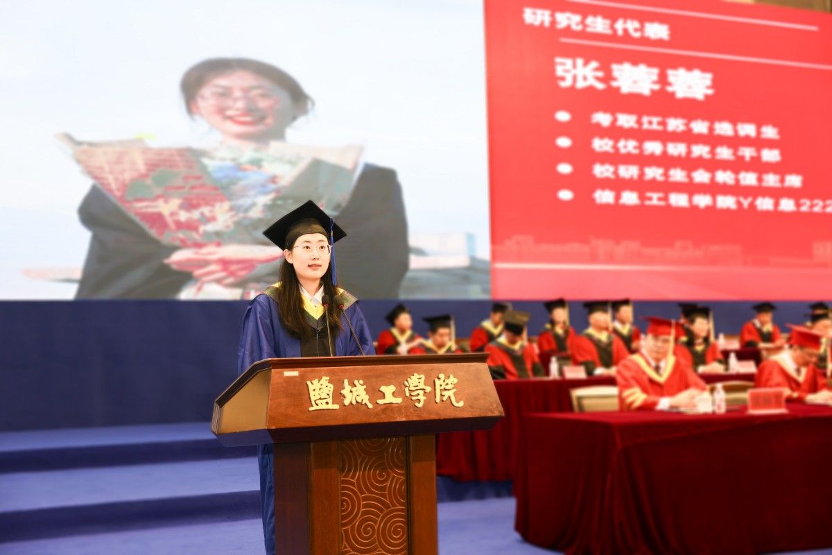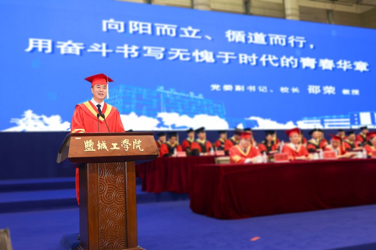 邵荣作题为《向阳而立、循道而行,用奋斗书写无愧于时代的青春华章》的讲话。他代表学校党委、行政和全校师生员工,向即将奔赴下一站的毕业生表示祝贺,向付出心血汗水的父母、亲友和老师表示感谢。他与全体毕业生分享了学校近年来事业发展成果,回顾了同学们在校期间用青春智慧、杰出贡献、勤奋努力书写的精彩篇章。他欣慰于同学们与盐工同呼吸、共成长,见证学校的日新月异,为学校发展谱写华章,骄傲于同学们用实际行动生动诠释“勤奋会谋事、踏实肯干事、团结能成事”的“盐粒子”特质,为母校赢得尊重和荣光。