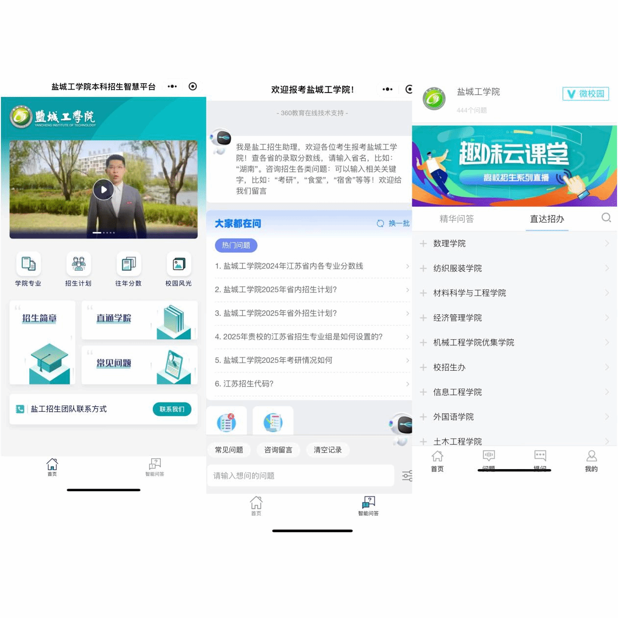针对省外考生,学校在教育部“阳光高考网”设置盐城工学院招生咨询答疑平台;针对省内考生,参加江苏省教育考试院官网举办的高校招生线上咨询周活动。学校本科生招生网设置了网上咨询模块,积极对全国各地的考生所关心的招生问题进行一一答疑。搭建招生智慧平台,将招生政策、招生计划、往年分数、学院专业等模块进行移动端整合,多维度满足考生信息获取需求,构建更具活力、更具传播力的宣传机制。截止到发稿前,我校在江苏高考网上咨询会人气排名位居前三,而且热度还在持续增长中。