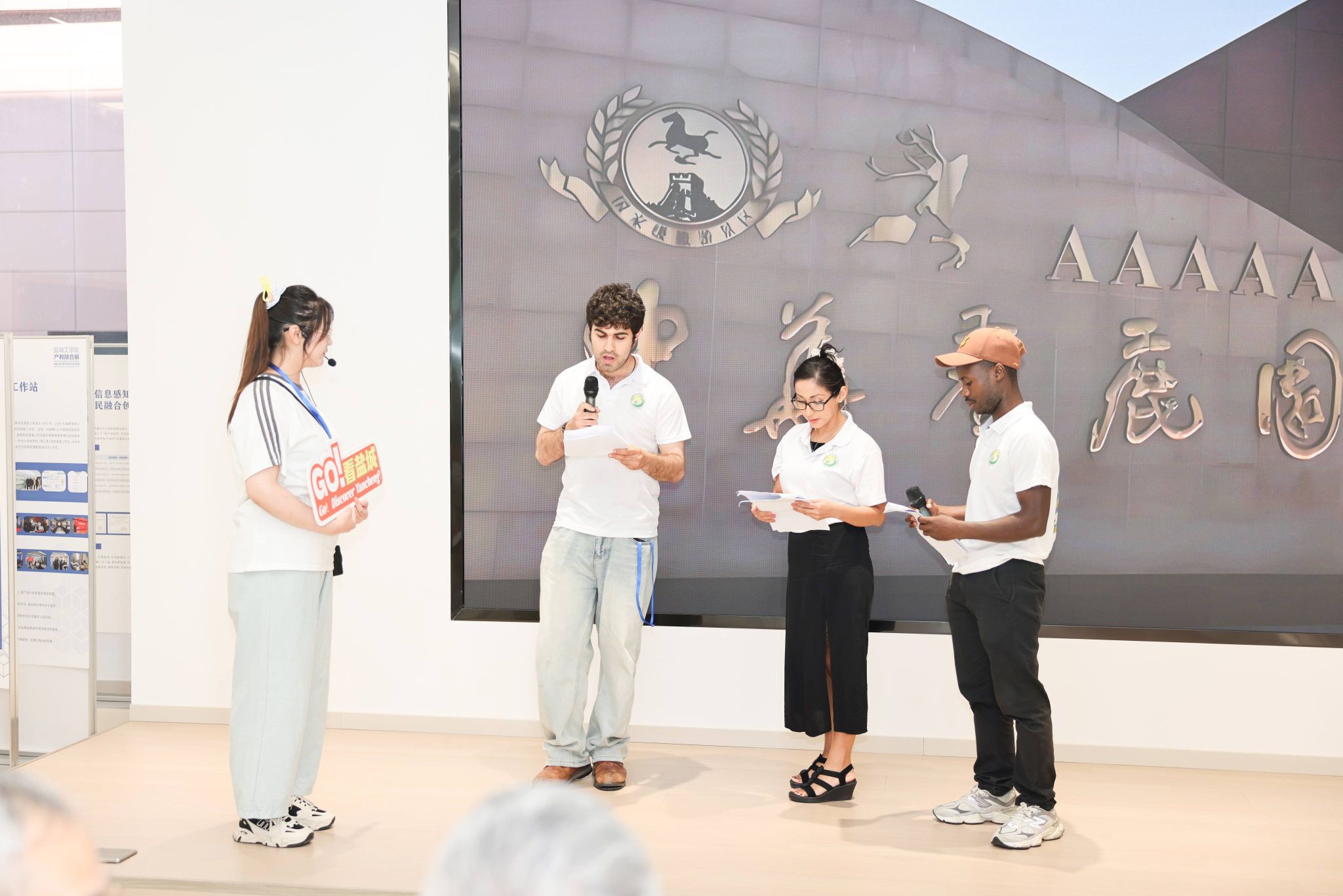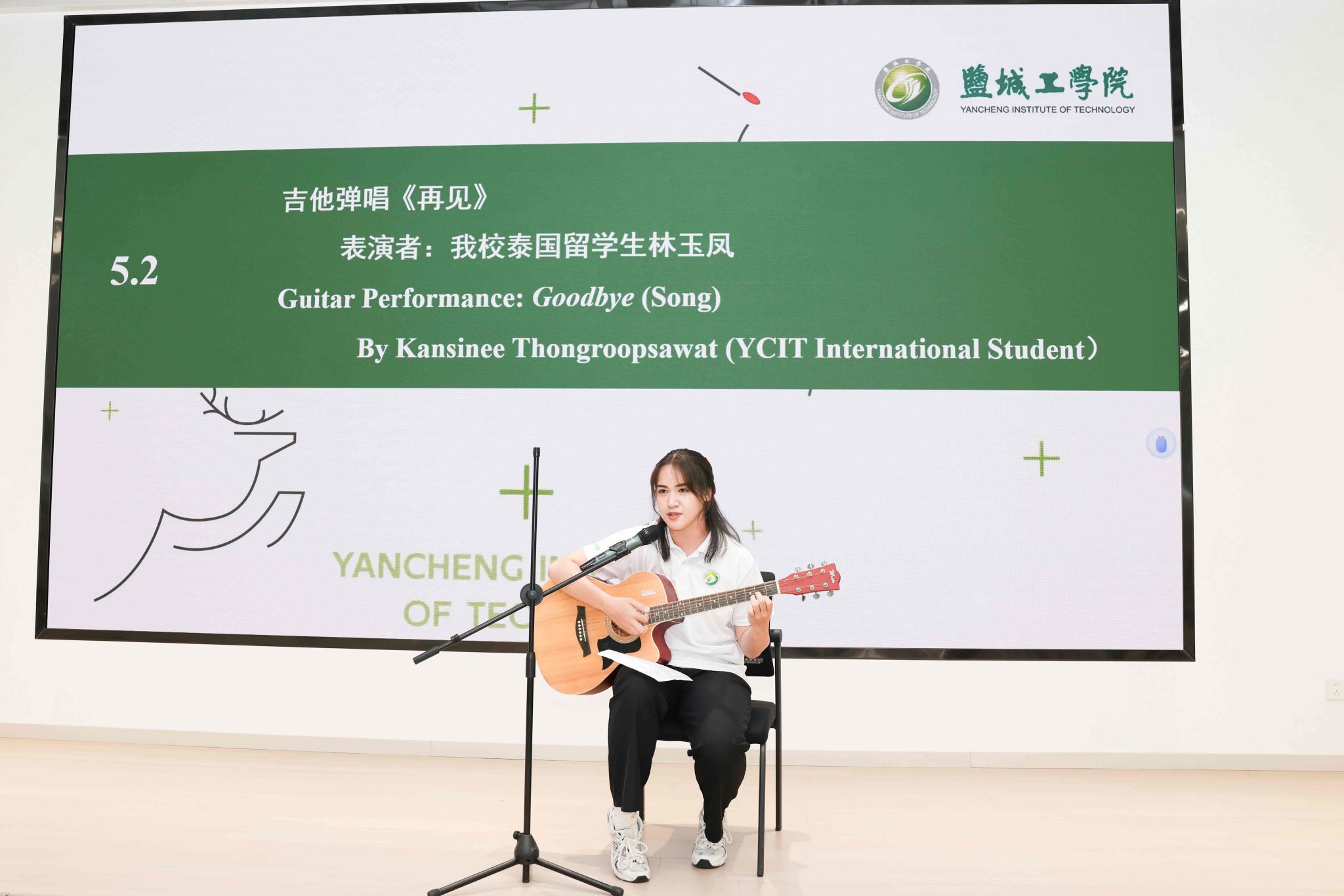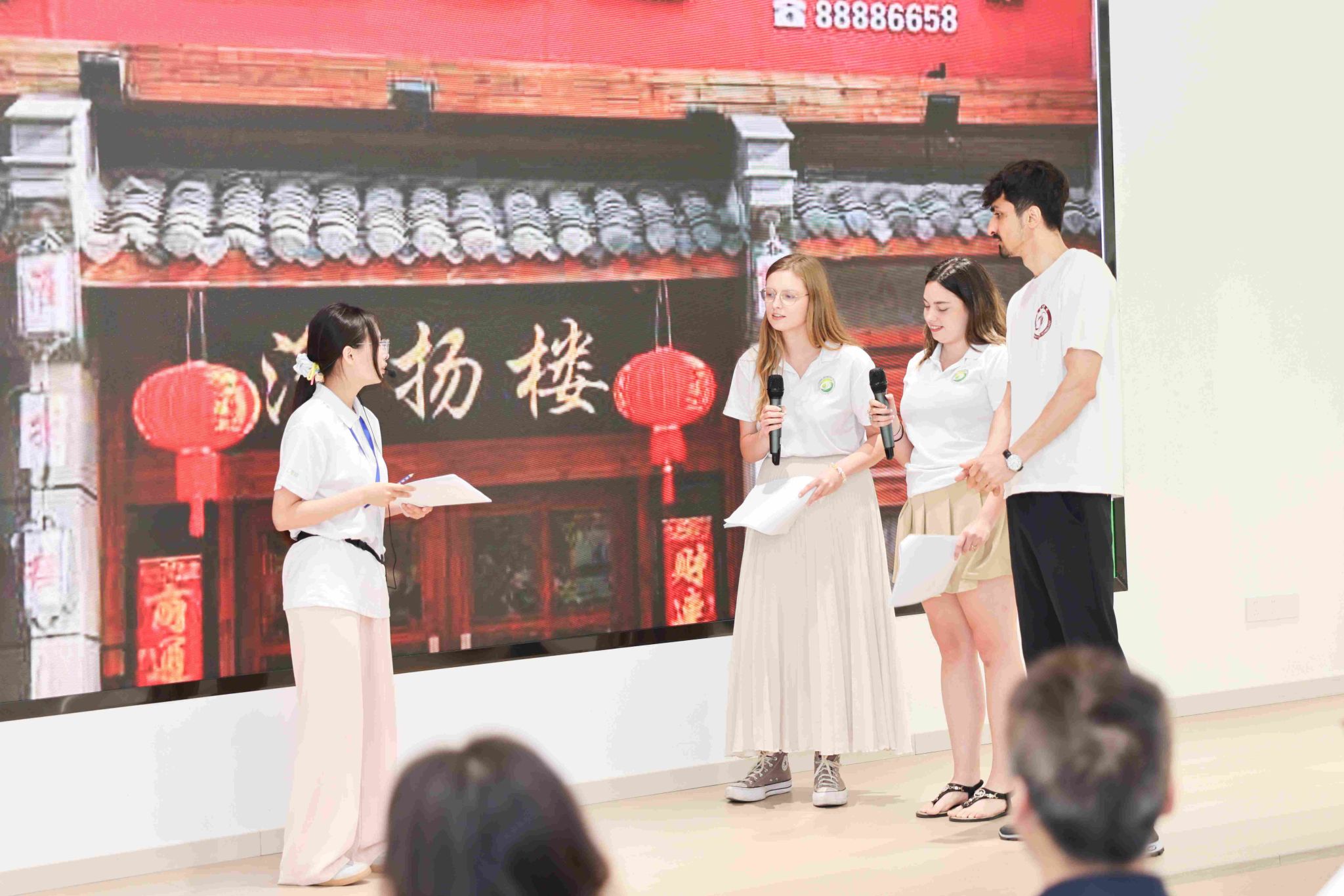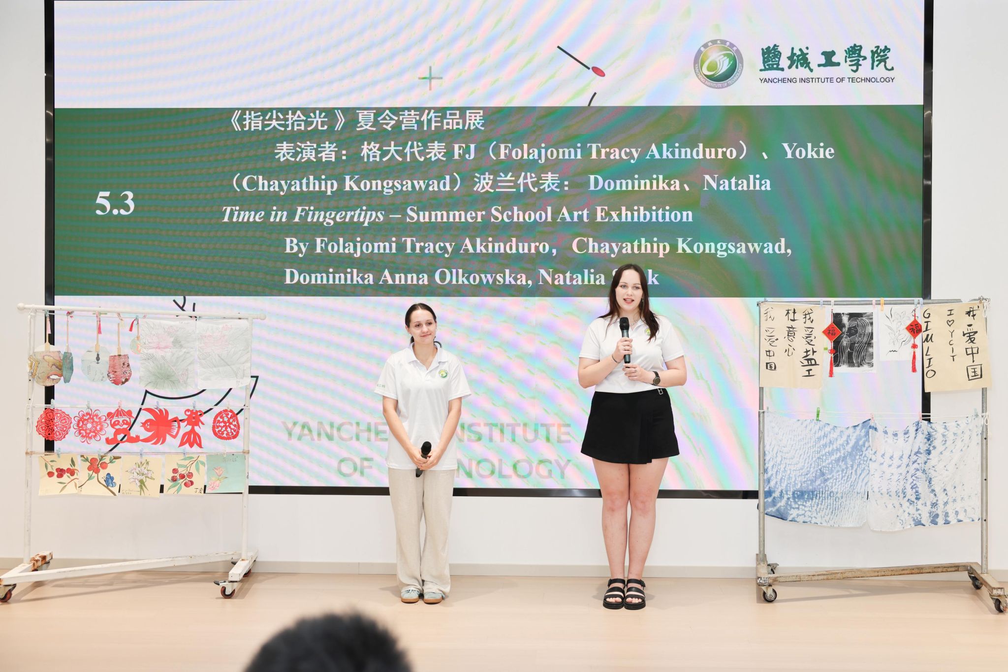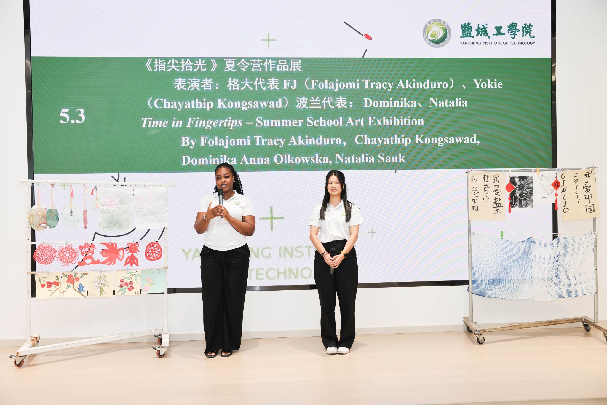 精彩纷呈的学员成果展示将气氛推向高潮。安娜等学员表演的中文情景对话《仲夏盐韵,文化作舟》以三幕短剧生动再现他们的盐城探索之旅;泰国留学生林玉凤的吉他弹唱《再见》饱含离情别绪;杜意心等学员以饱满的热情,带来了《卜算子》《相思・红豆》等诗歌朗诵;《指尖拾光》作品展中,书法、国画、剪纸、版画、扎染、漆扇等学员作品惊艳亮相。每一个节目都凝聚着学员们的学习成果与文化感悟,赢得现场阵阵掌声。