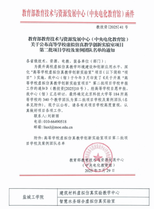 近日,教育部教育技术与资源发展中心(中央电化教育馆)正式公布高等学校虚拟仿真教学创新实验室项目第二批入选学校及案例团队名单,我校“建筑材料虚拟仿真实验教学中心”与“智慧水务综合虚拟仿真实验室”双双跻身榜单,标志着学校在虚拟仿真实验教学领域的建设再获认可,实现新的突破。