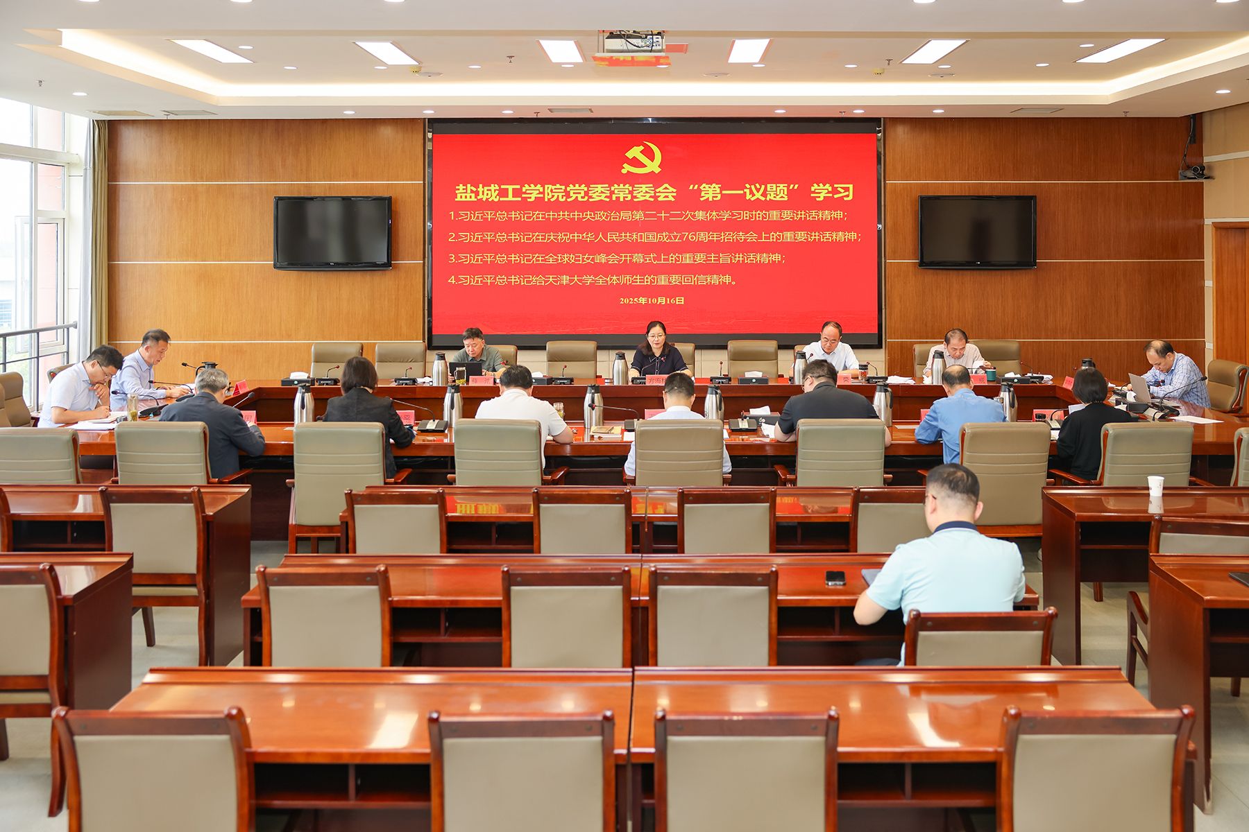 党委书记方海林主持。党委副书记、校长邵荣,党委副书记薛浩,副校长、盐城市政协副主席丁成,党委常委、副校长王伟,党委常委、纪委书记、省监委派驻监察专员陈伟,党委常委、副校长张勤芳、邢晓平,党委常委、统战部部长姚军,党委常委、宣传部部长奚新国,党委常委、组织部部长包雅玮,党办、校办、纪委机关等部门主要负责人参加。