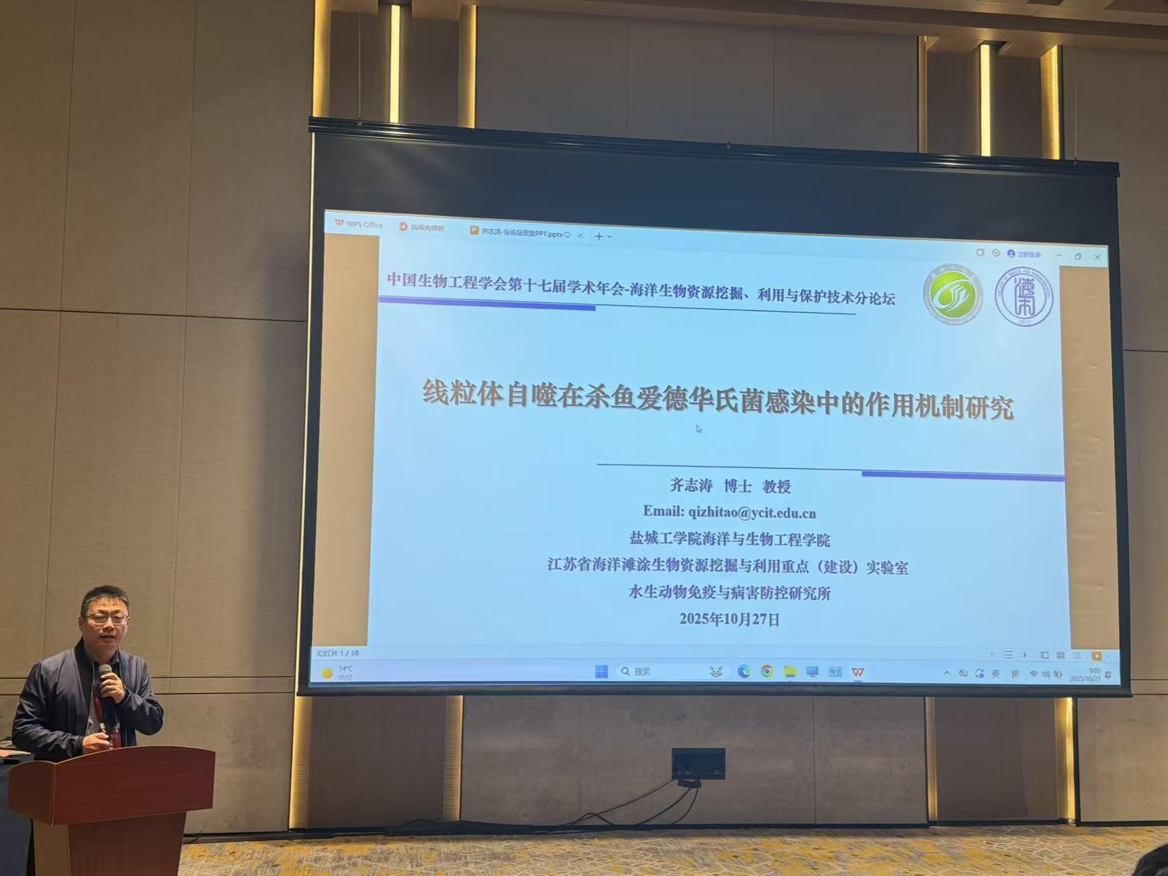 齐志涛以《线粒体自噬在鱼类杀鱼爱德华氏菌感染中的作用机制研究》为题作特邀报告,从杀鱼爱德华氏菌感染是否引起鱼类发生线粒体自噬、杀鱼爱德华氏菌感染诱导线粒体自噬的分子途径以及线粒体自噬对杀鱼爱德华氏菌胞内生存有何影响等方面,系统汇报了团队在鱼类线粒体自噬抗菌免疫方面的最新研究进展。