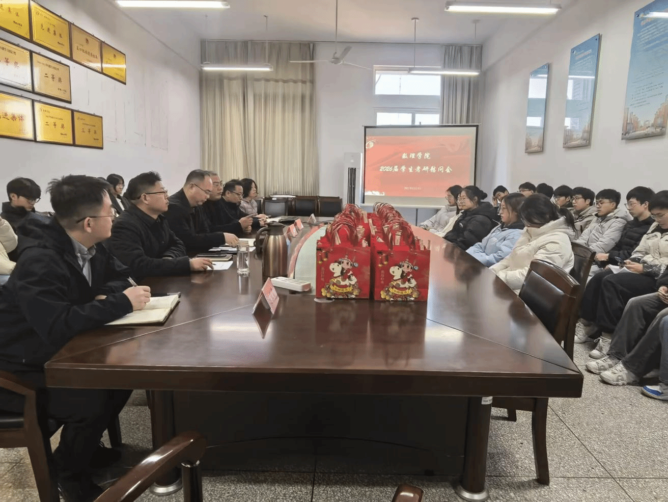 为鼓舞考研学子斗志,缓解备考压力,传递学院的温暖关怀,12月3日,数理学院党总支书记魏伟华、院长徐宁、副院长田灿荣看望慰问正在紧张备战的2026届考研学生,并为同学们送上饱含祝福与鼓励的“考研暖心礼包”。活动由党总支副书记许众威主持,学院毕业班辅导员参加。