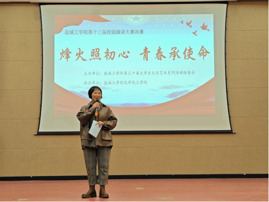 12月3日晚,由共青团盐城工学院委员会主办,化学化工学院承办的第三十届校园文化艺术节子项目——第十三届“烽火照初心,青春承使命”校园演讲大赛决赛,在北校区知达楼五四报告厅举行。原工会主席孙琴,党委宣传部副部长赵迎华、学生处副处长马晓英、校团委副书记胥爱国、化学化工学院党委副书记邵景玲受邀担任比赛评委,全校400余名师生现场观赛。