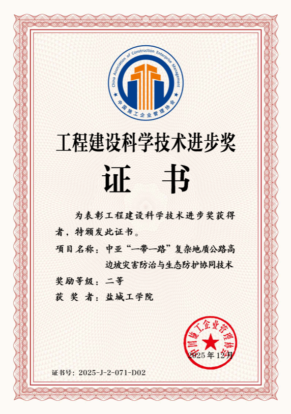 近日,中国施工企业管理协会正式公布了2025年工程建设科学技术奖获奖名单。我校土木工程学院,王照宇教授、程昀副教授重点参与的《中亚多震山区公路高边坡灾害防控关键技术及工程应用》荣获科学技术进步二等奖。该项目由中国路桥工程有限责任公司牵头,西安建筑科技大学、盐城工学院作为主要完成单位协同攻关,针对中亚复杂地质环境下的工程难题取得重要突破。此次评选共授予329个科学技术进步奖,其中一等奖29项、二等奖130项、三等奖170项,覆盖了绿色低碳与可持续发展、数字化与智能建造、重大工程系统技术与防灾减灾等研究领域。