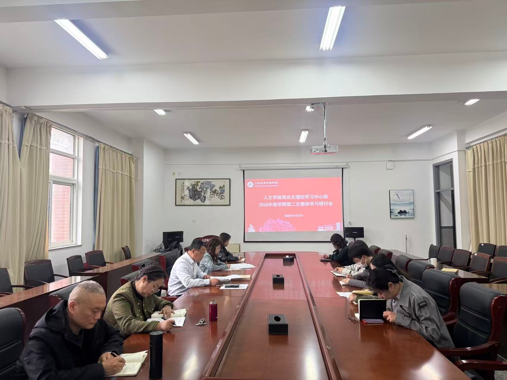 4月27日下午,在仁和楼A304会议室,人文学院党总支理论学习中心组召开2026年春学期第二次集体学习研讨会。会议由学院党总支书记何登溢主持,党总支理论学习中心组成员参加。
