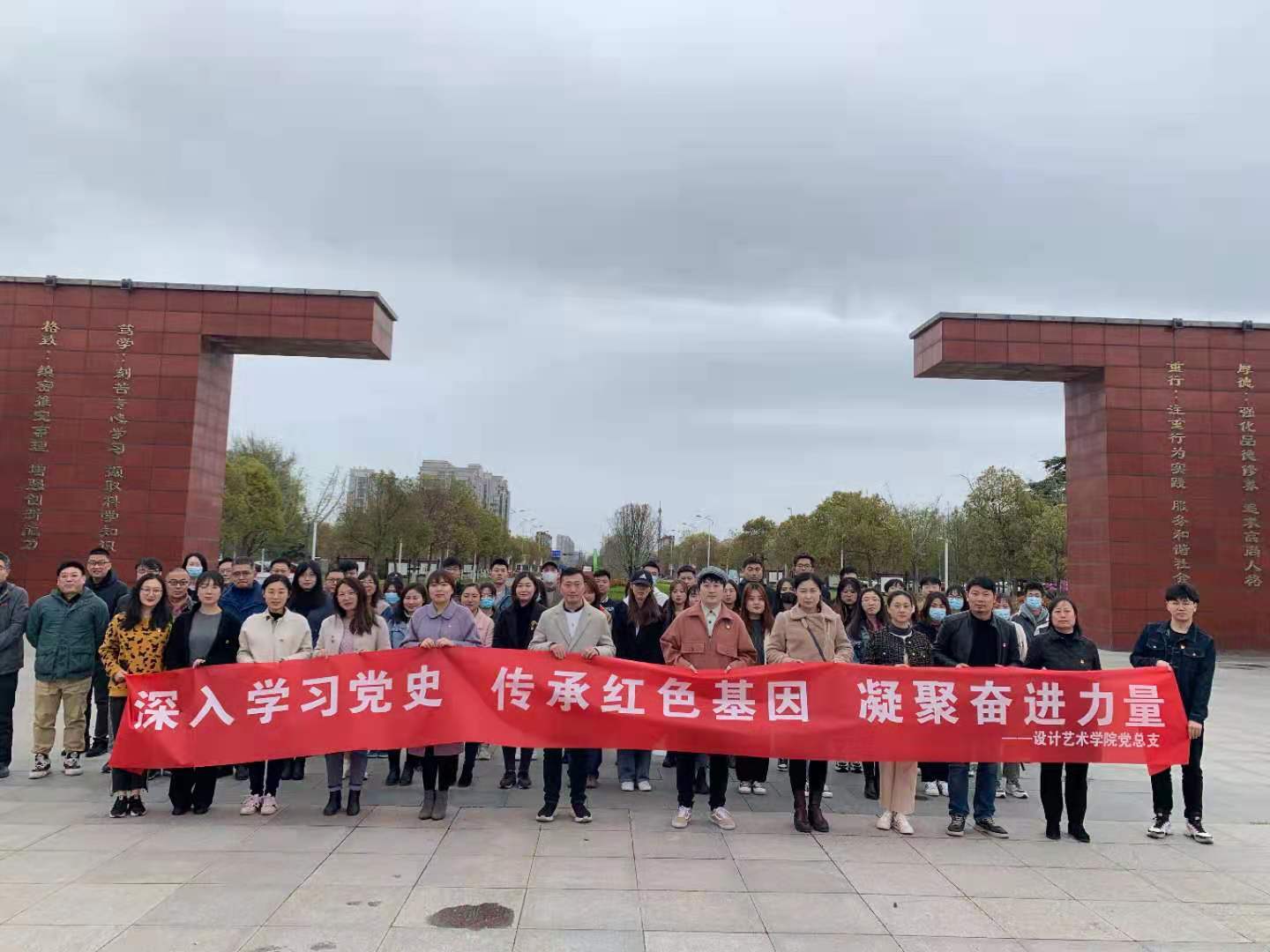 3月31日下午,设计艺术学院党总支在南校区铁军广场开展“深入学习党史、传承红色基因、凝聚奋进力量”主题党日活动,学院党总支书记胡凌霞主持,学院中心组成员、全体教工党员和学生党员等60余人参加活动。