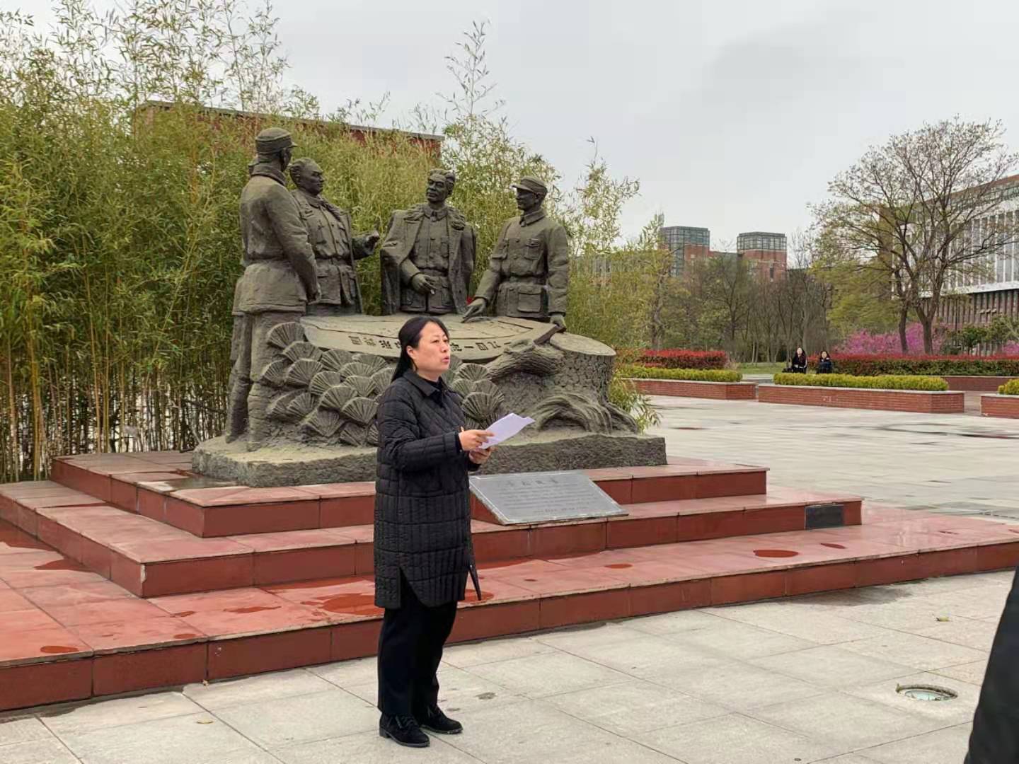 胡凌霞结合校史向介绍了铁军广场背后的故事,讲述了我校充分利用革命老区红色文化资源,传承、弘扬新四军“铁军精神”,坚持用“铁军精神”办学、用“铁军精神”育人的办学历程。