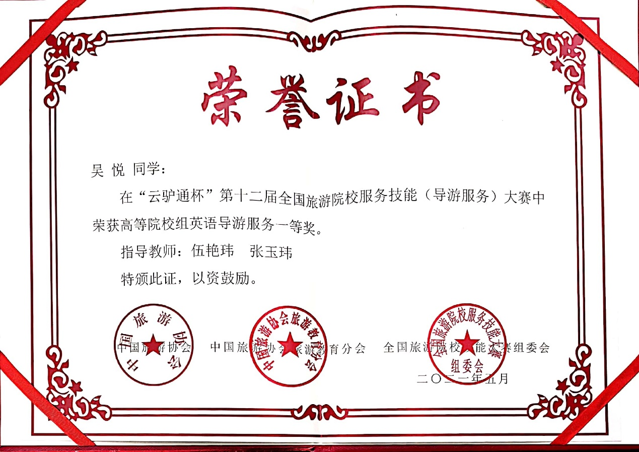 经过激烈角逐,我校人文学院总成绩排名位列第24名,学院荣获“团体奖”。张玉玮、伍艳玮和韩双斌老师指导的4名学生全都获奖,其中陈泊翰、孙菁分获普通话导游服务一等奖、二等奖,吴悦、金庭竹分获英语导游服务一等奖、二等奖。人文学院历来注重应用型、创新型人才培养,鼓励学生积极参与各类学科竞赛,知行合一、学以致用。