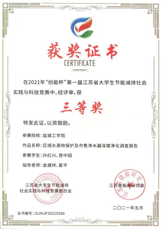 5月15日,由东南大学,江苏省能源研究会主办的第一届江苏省大学生节能减排社会实践与科技竞赛结果揭晓,我校环境学院金建祥、周英贵老师指导,优培学院B理化181陈蕾、环境学院B环设191苏发敏、陈雨薇同学项目《“会呼吸的树”——节能高效的树形空气净化器》入围决赛,并获一等奖;金建祥、翟平老师指导,环境学院B环设192孙红兴、B环境184营中园同学项目《区域水源地保护及市售净水器深度净化调研报告》获三等奖。学校还获得优秀组织奖。