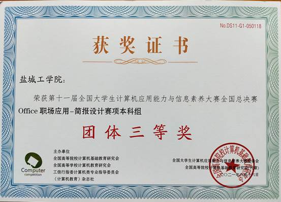 近日,“第十一届全国大学生计算机应用能力与信息素养大赛”全国总决赛在线上进行。经过激烈角逐,在ICT计算机基础大赛项目中,我校获团体三等奖,B物联网192班吴金龙、B机制196班张子茹2位同学获二等奖,D计算机193班左方慧等10人获三等奖,邵洪成等2位老师获二等奖指导教师称号,孙久等10位老师获三等奖指导老师称号。在BAP Office商务应用能力大赛项目中,盐城工学院获团体三等奖,D工管201班邹东旭获一等奖,B计算机191班张华等13人获三等奖,董琴等10位老师获三等奖指导老师称号,盐城工学院获得突出贡献奖。