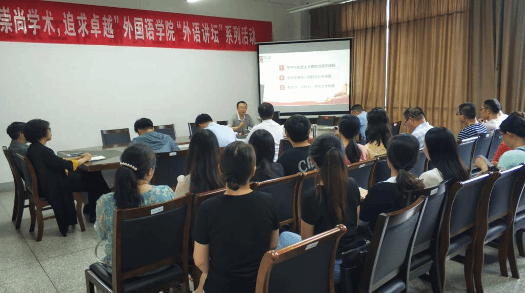 7月7日下午,在南校区润美楼A401会议室,外国语学院党总支书记谷文华为教工支部党员上题为《铭记党史、坚守初心、勇于担当》的党史学习教育专题党课。