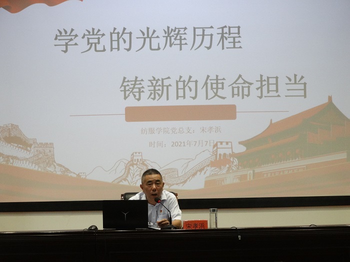 7月7日上午,在南校区土木馆报告厅,纺织服装学院党总支书记宋孝浜以《学党的光辉历程铸新的使命担当》为题上党史学习教育专题党课。校党委党史学习教育巡学督学第三指导组组长杨怀祥、副组长朱凌、组员曹玉娟出席,纺织服装学院全体党员、中心组全体成员、部分入党积极分子参加。