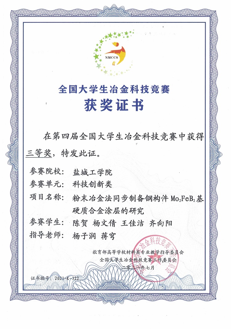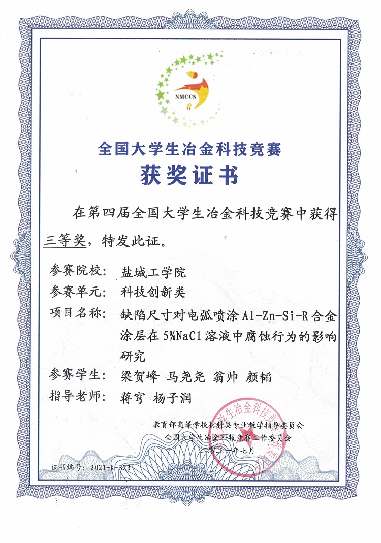 近日,第四届全国大学生冶金科技竞赛结果公布,我校材料科学与工程学院杨子润、蒋穹、张柳等老师指导,梁贺峰、马尧尧、翁帅、颜韬等同学完成的作品《缺陷尺寸对电弧喷涂Al-Zn-Si-R合金在5%NaCl溶液中腐蚀行为的影响研究》;陈贺、杨文倩、王佳洁、齐向阳等同学完成的作品《粉末冶金法同步制备钢构件Mo2FeB2基硬质合金涂层的研究》均获得科技创新类三等奖,张威、张莹莹、顾文浩、李嘉豪等同学完成的作品《高性能层状B4C/Al复合材料制备》获科技创新类优胜奖。